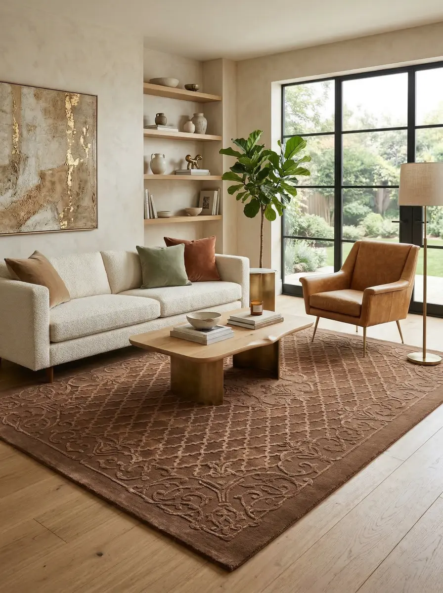 Ce tapis monochrome en relief joue sur la subtilité des tons bruns et sur une texture riche. Le motif central, inspiré des arabesques orientales, se révèle au gré de la lumière. Arabesque Café exprime une élégance discrète, entre tradition et modernité.