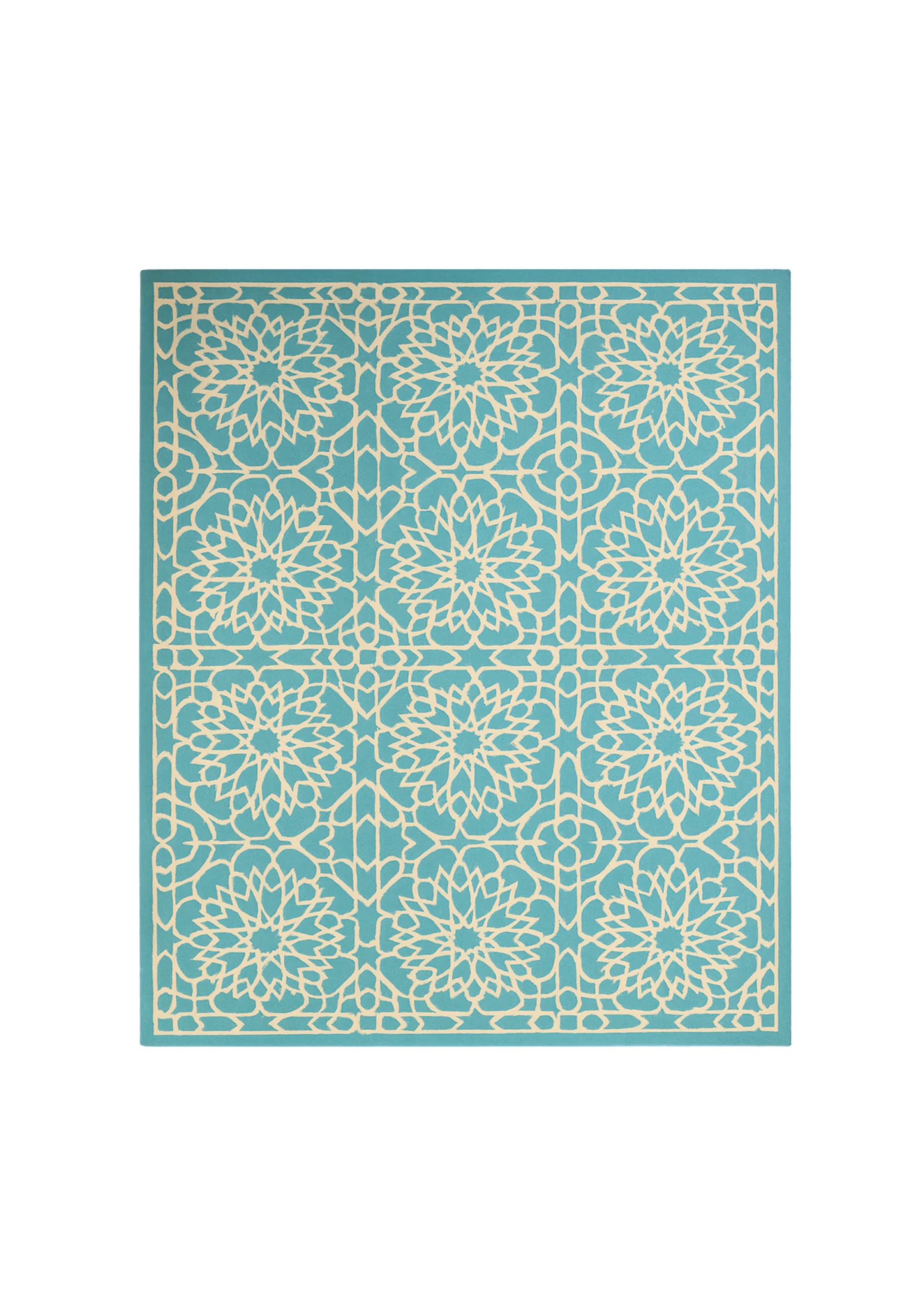 Sur fond turquoise lumineux, Éclat d’Azur déploie un réseau de fleurs ivoire ciselées. Son motif régulier, presque hypnotique, évoque la fraîcheur d’un patio andalou et l’eau scintillante d’une fontaine. Un tapis solaire, qui marie tradition artisanale et modernité éclatante.