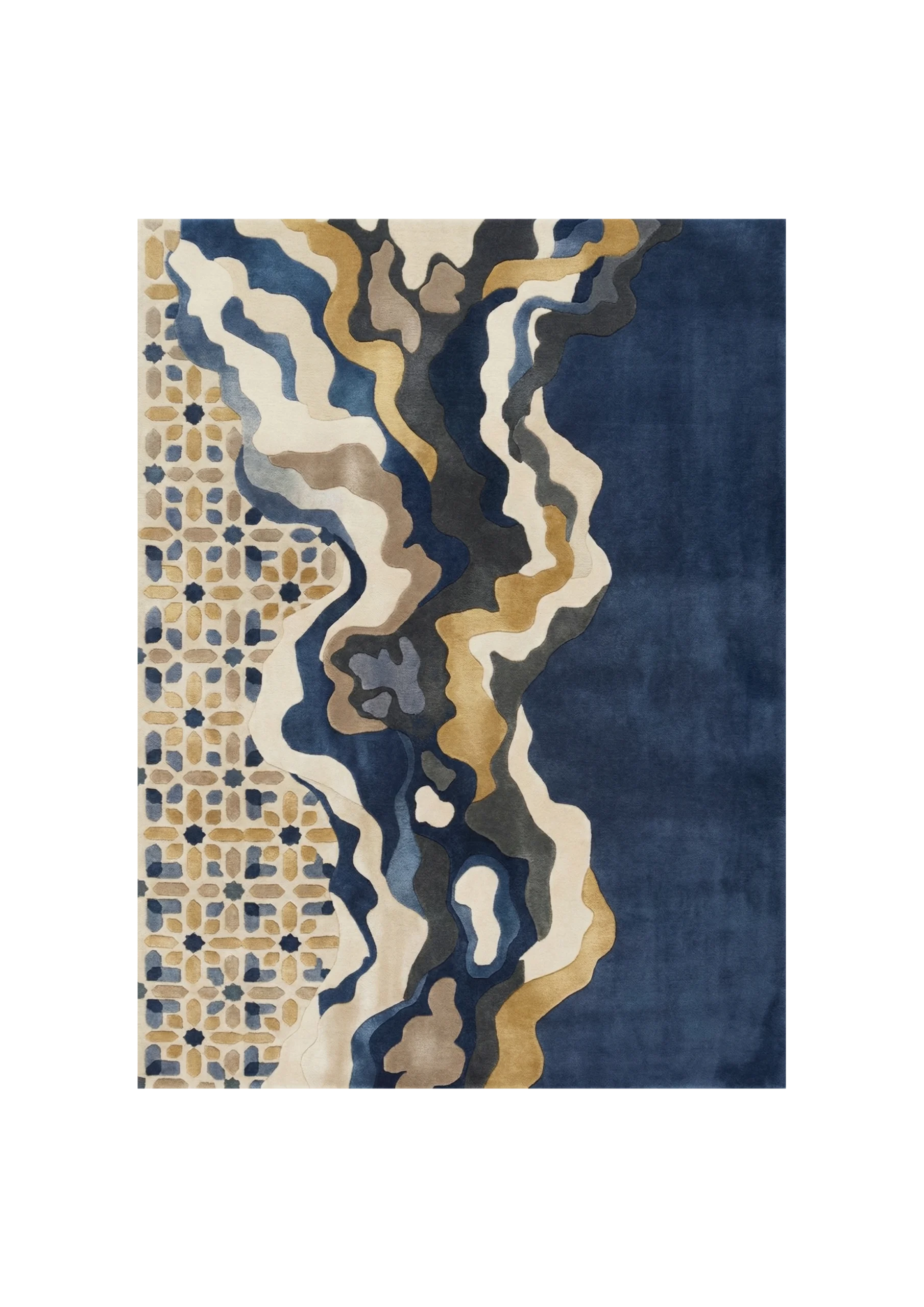 Lisière d’Atlas célèbre la rencontre entre structure et mouvement. D’un côté, la rigueur géométrique des motifs inspirés de la mosaïque ; de l’autre, des lignes fluides aux nuances d’azur et de sable qui évoquent un paysage en transition. À la frontière entre héritage et nature, ce tapis apporte profondeur, caractère et élégance contemporaine à l’espace.