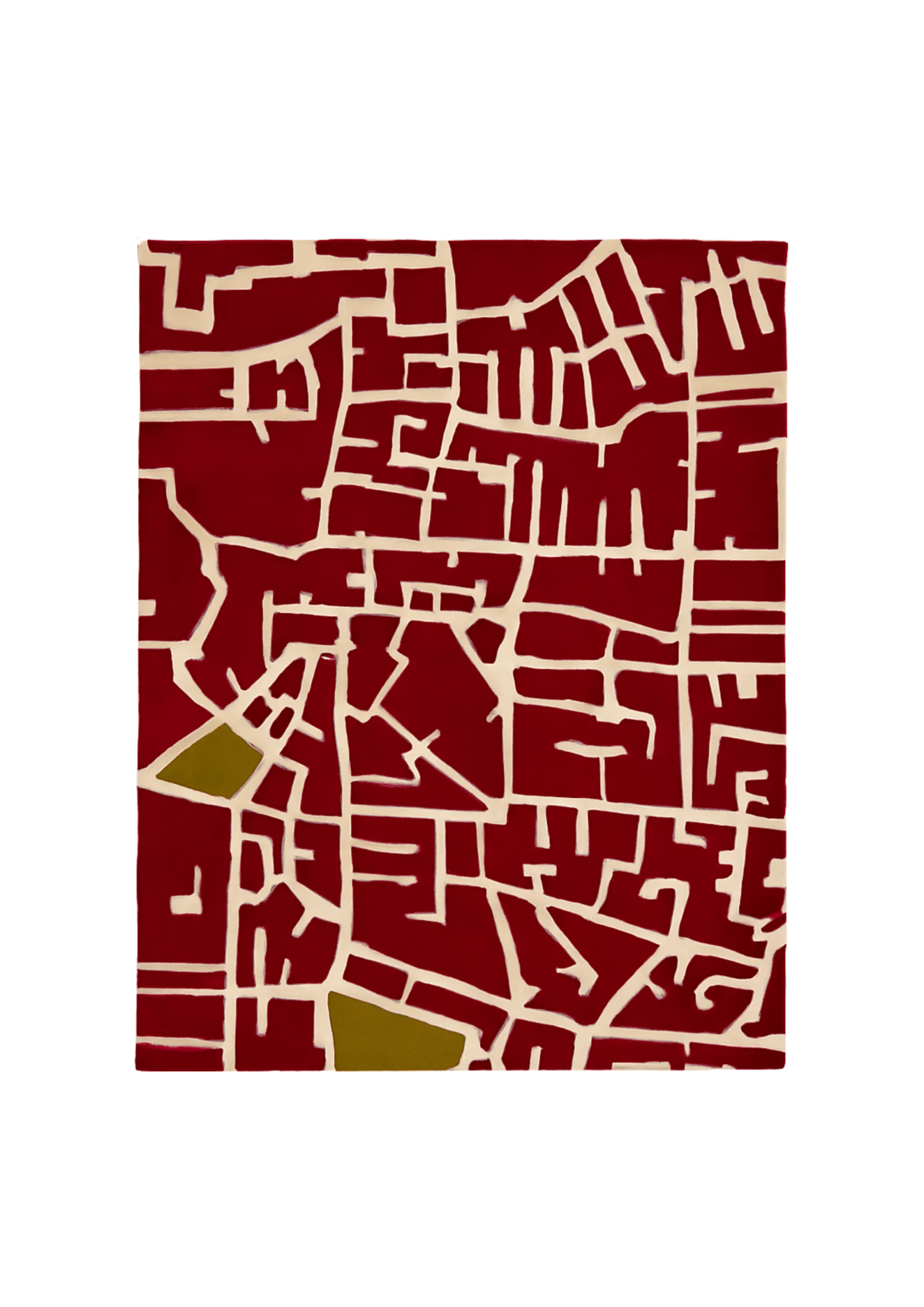 Sur un bordeaux intense, un réseau sinueux d’allées ivoire se déploie comme le plan d’une médina vu du ciel. Çà et là, deux enclaves kaki soulignent l’effet de cartographie abstraite et invitent l’œil à se perdre dans ce dédale graphique. Un tapis qui conjugue esprit urbain et élégance orientale, parfait pour ancrer un espace contemporain ou enrichir un décor éclectique.