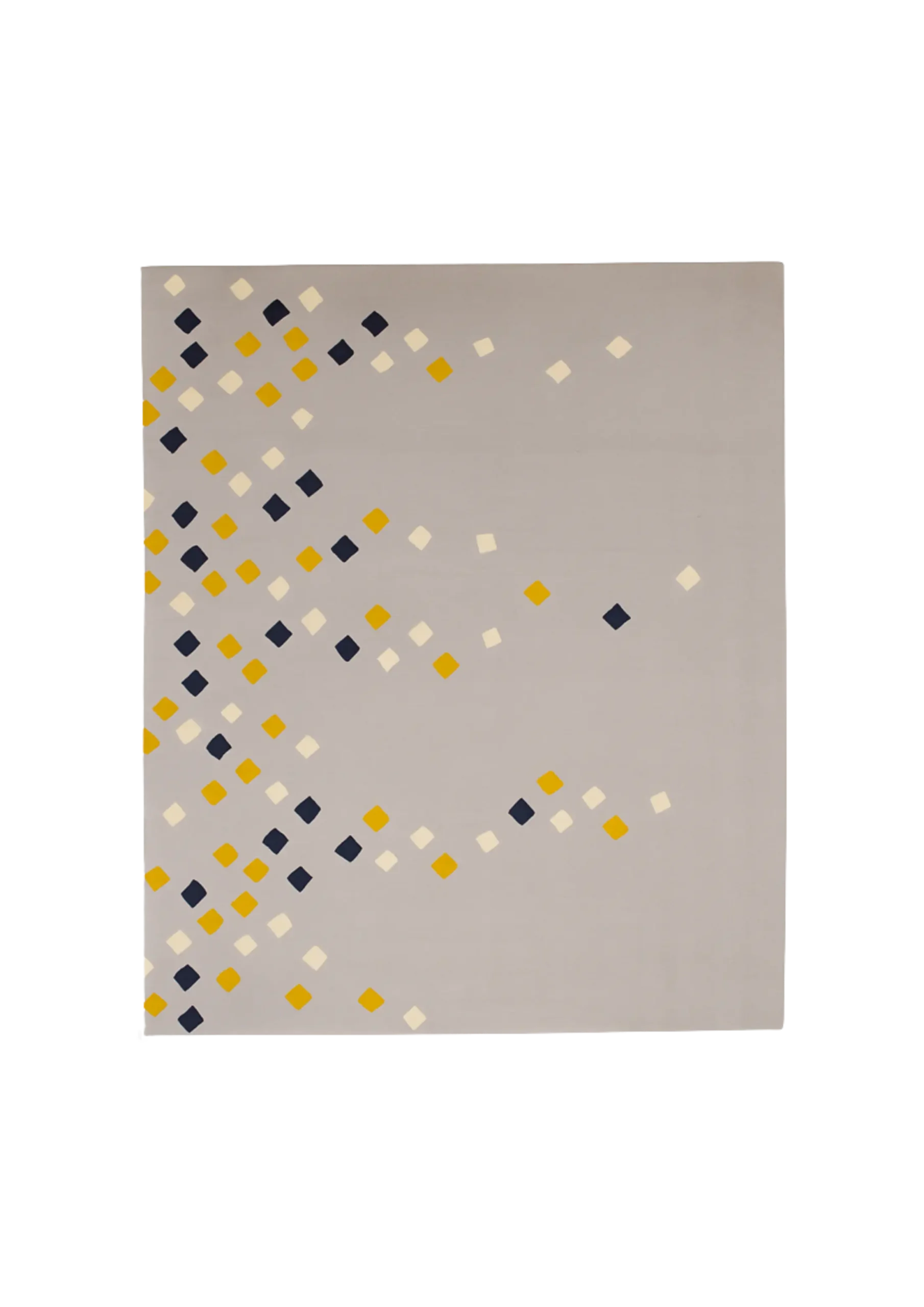 Pluie de Lumière suspend l’instant comme une pluie scintillante. Les losanges jaunes, ivoire et bleu marine se dispersent en cascade sur un fond doux et neutre, rappelant les reflets de lanternes flottant dans la nuit. Ce tapis respire la légèreté et l’éclat d’un ciel étoilé capturé dans un geste graphique.