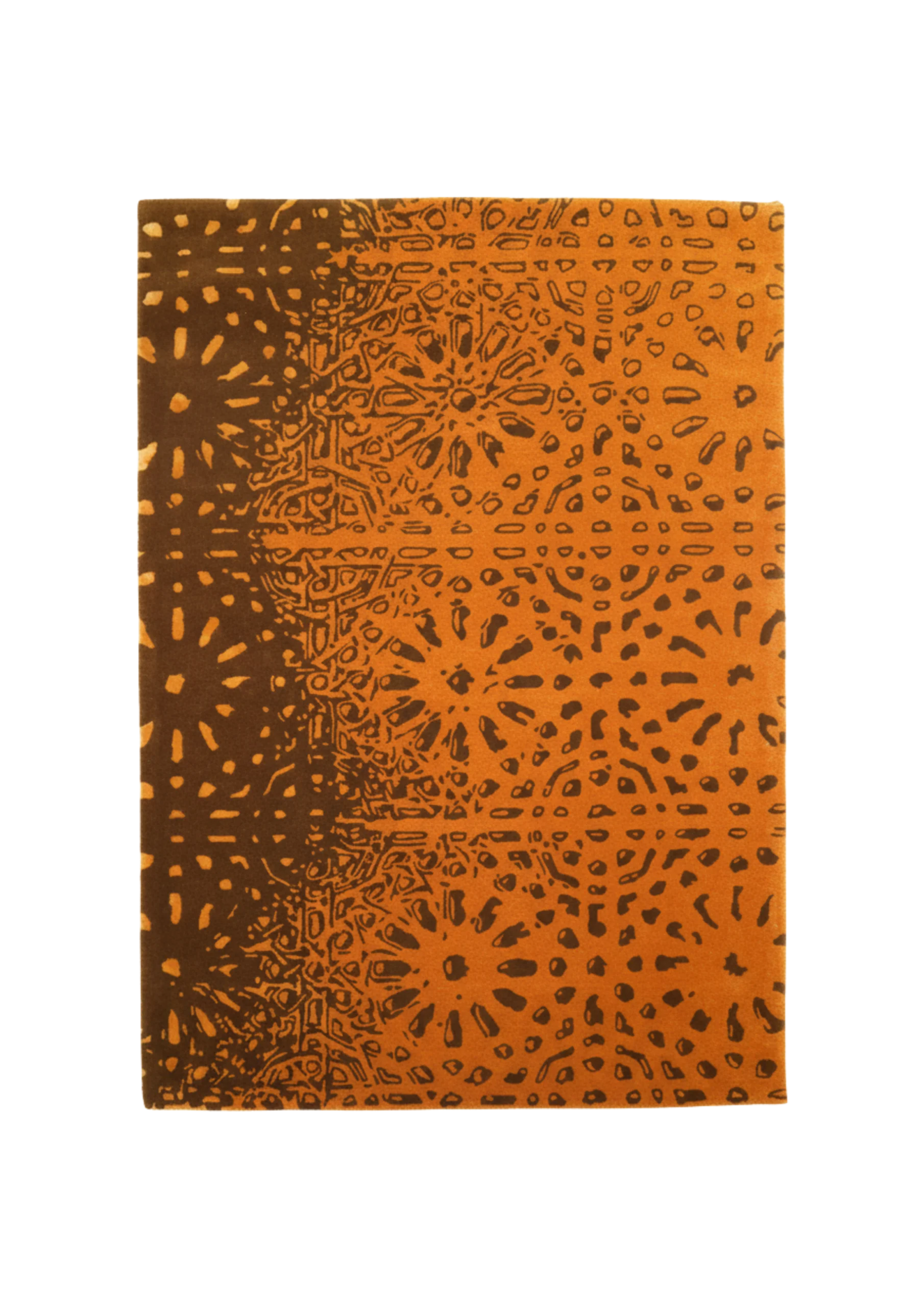 Soleil Ocre s’embrase dans une palette chaude et profonde, oscillant entre brun terre et orange flamboyant. Ses motifs ajourés, semblables à des rayons diffusés par un vitrail ancien, illuminent la surface comme une aurore minérale. Ce tapis réchauffe l’espace d’une intensité solaire.
